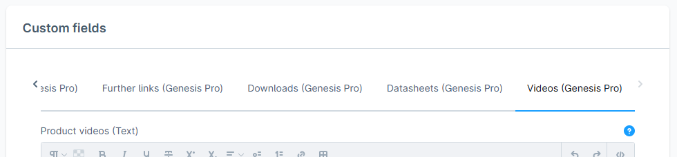> * Tab "Specifications" ⇒ Block "Custom fields" ⇒ Tab (Set) "Videos (... Pro)"